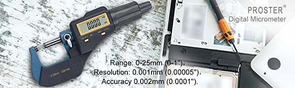 1.Range: 0-25mm (1") 2.Resolution: 0.001mm (0.00005") 3.Accuracy 0.002mm (0.0001").