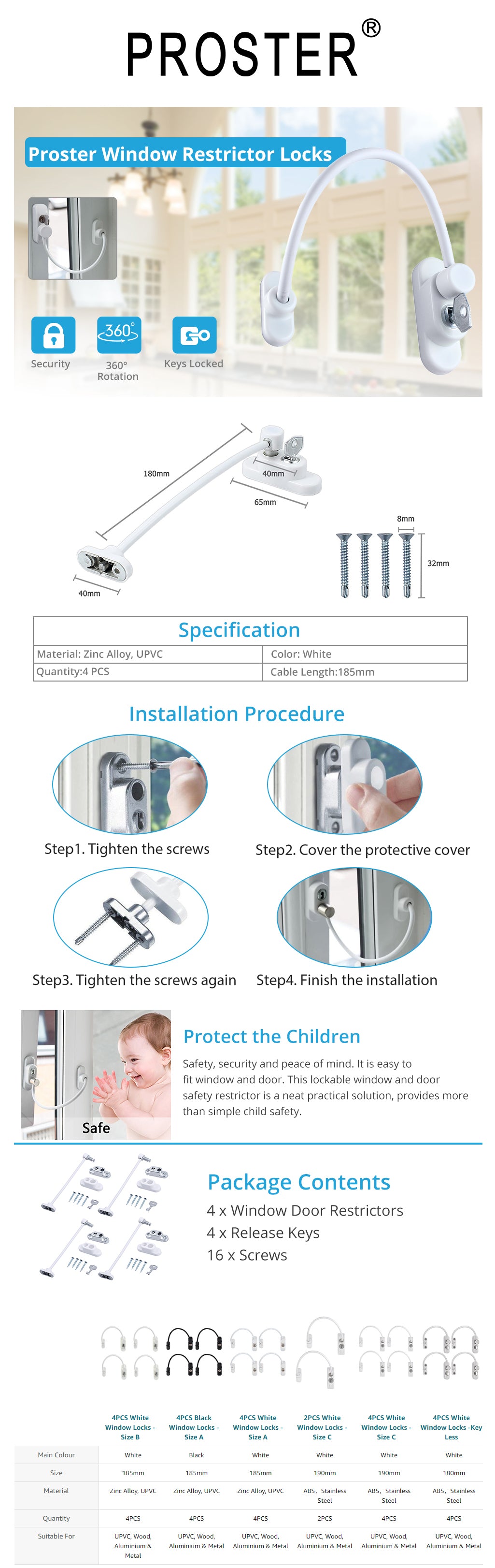 Proster Window Restrictor Locks 4 Packs Security Cable